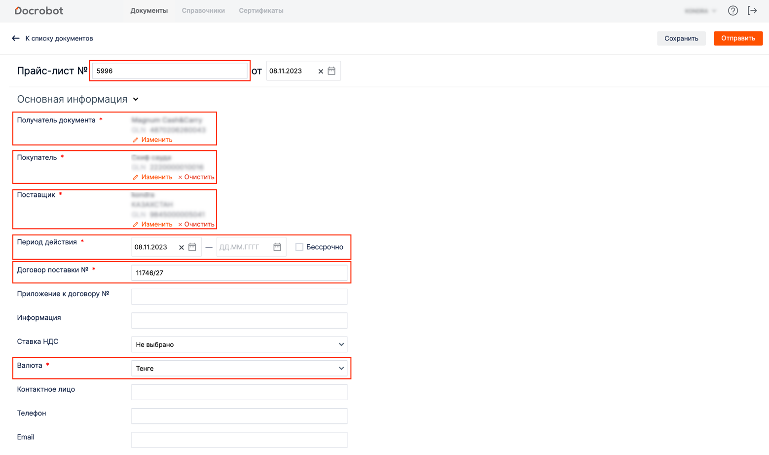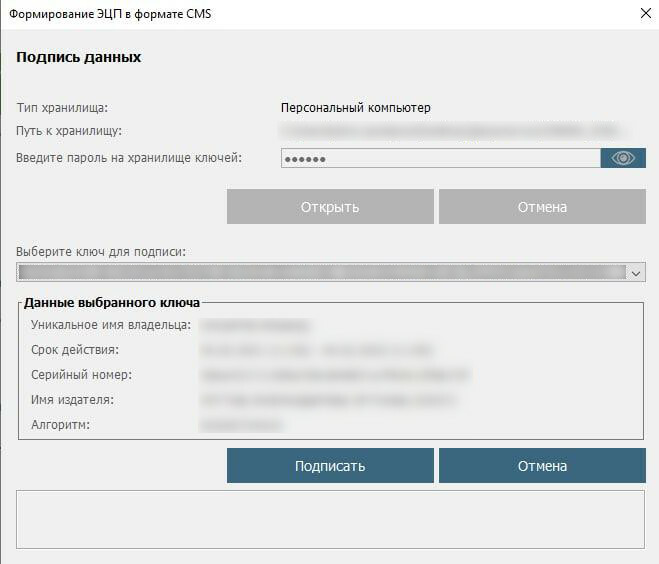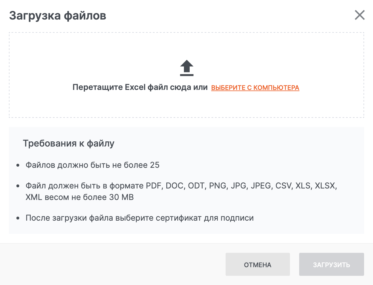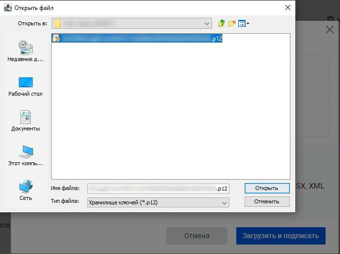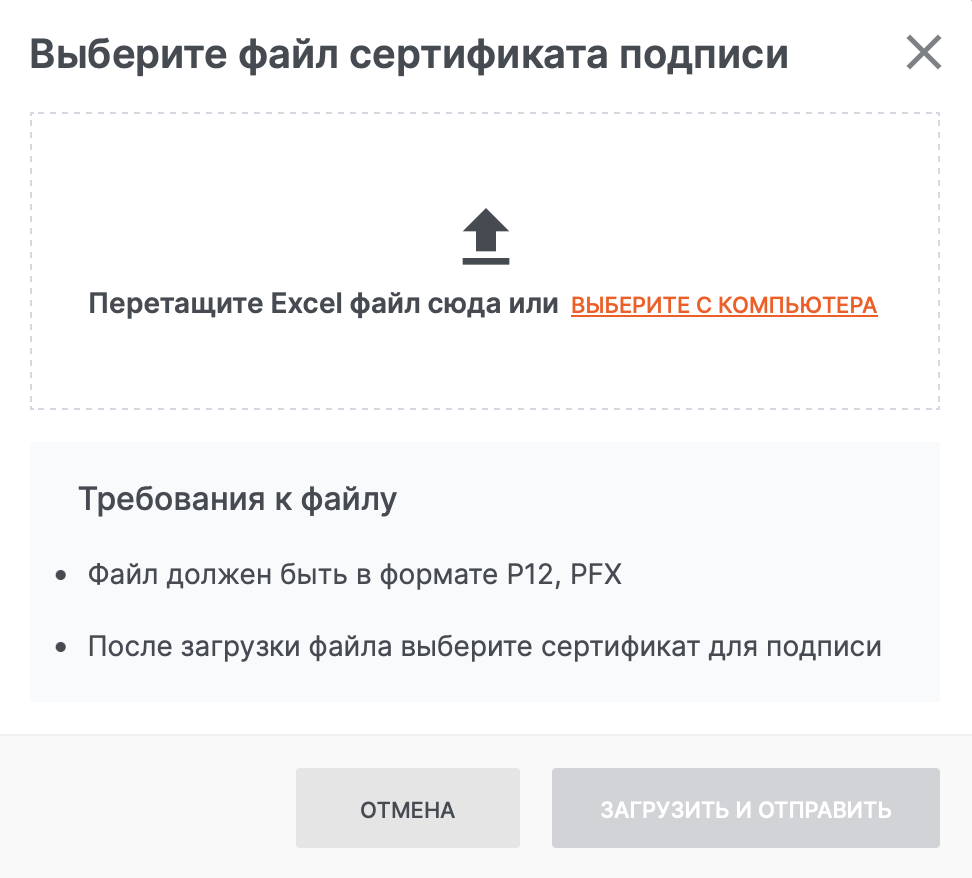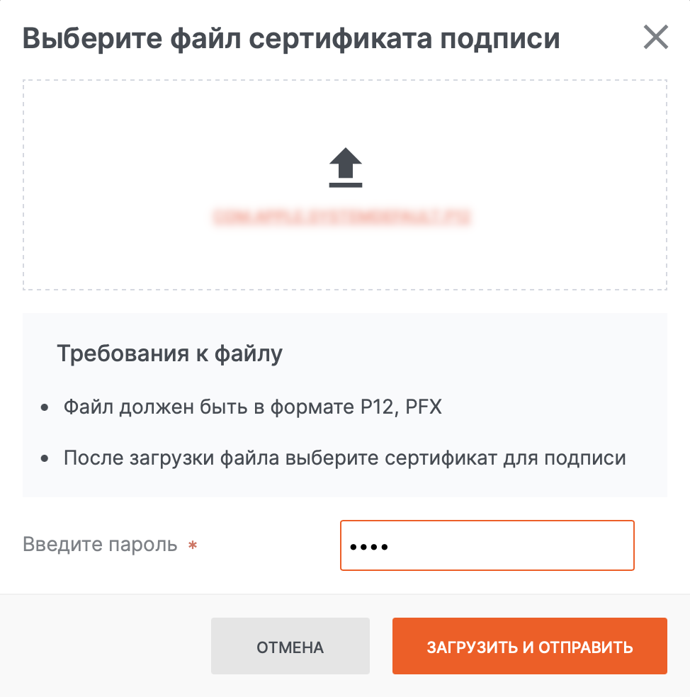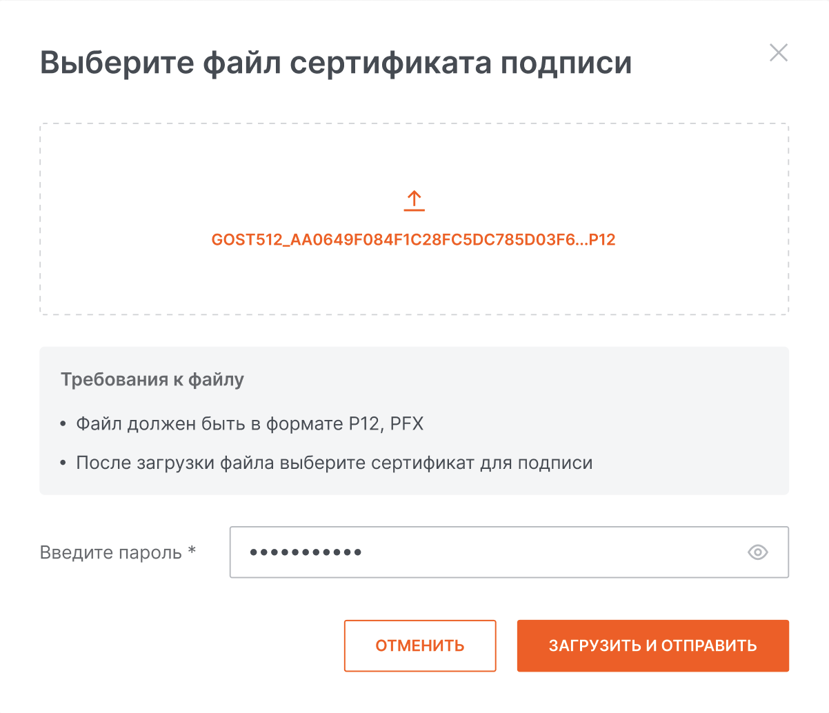 Далее, для подписи договора следует выбрать файл сертификата подписи, ввести пароль и нажать кнопку Загрузить и отправить: