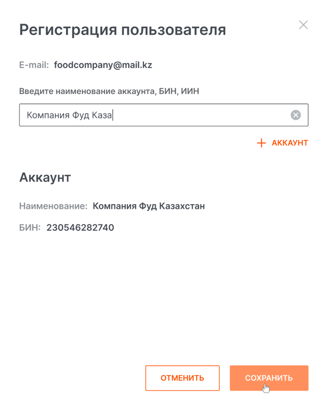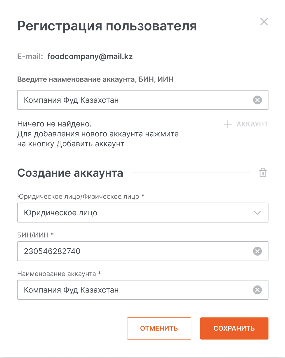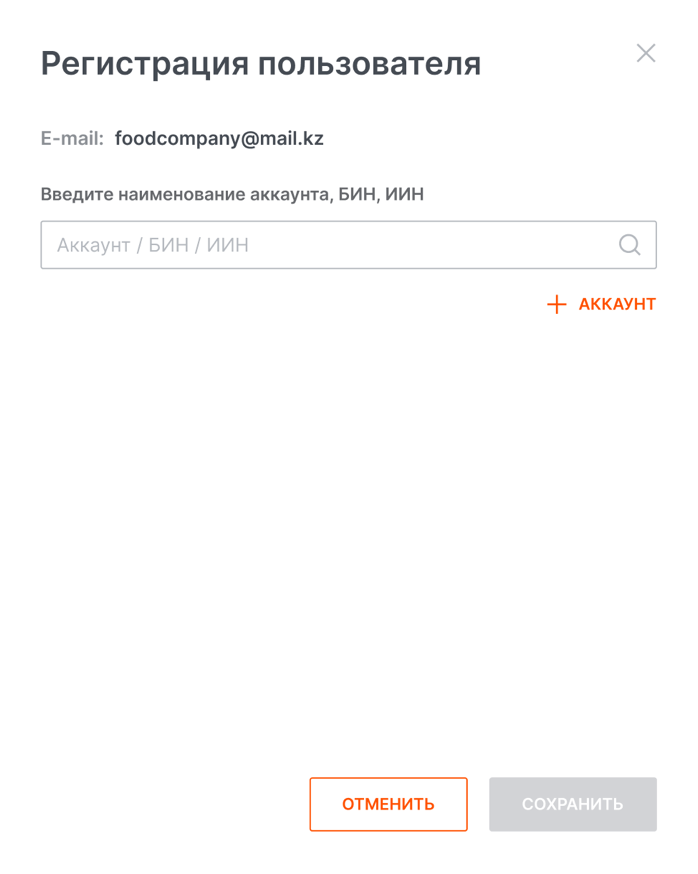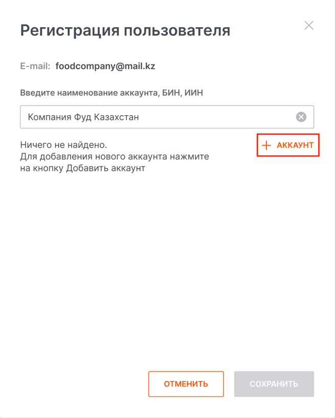 При нажатии на ссылку регистрации, откроется окно браузера, в котором необходимо заполнить формы. На первом шаге следует в строке поиска ввести наименование аккаунта, БИН или ИИН для поиска организации: