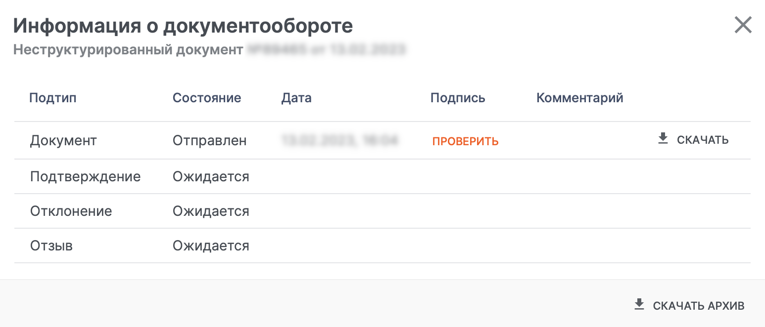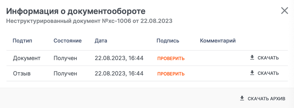 В окне Неструктурированного документа можно скачать архив, содержащий подписи, файлы-описатели, файл-вложение и сводный протокол с информацией о документообороте. Для этого следует нажать кнопку Скачать архив.