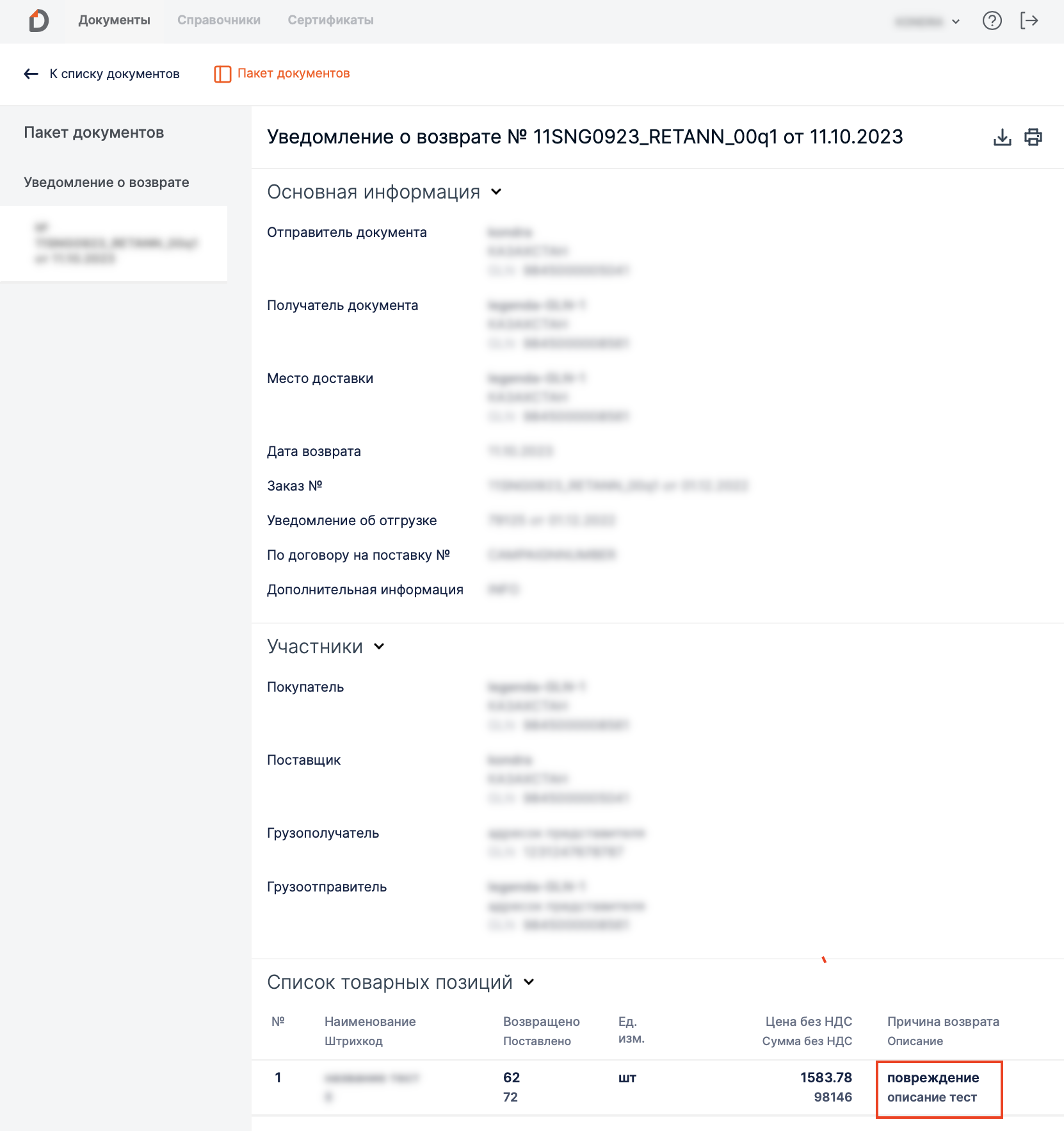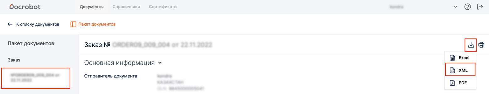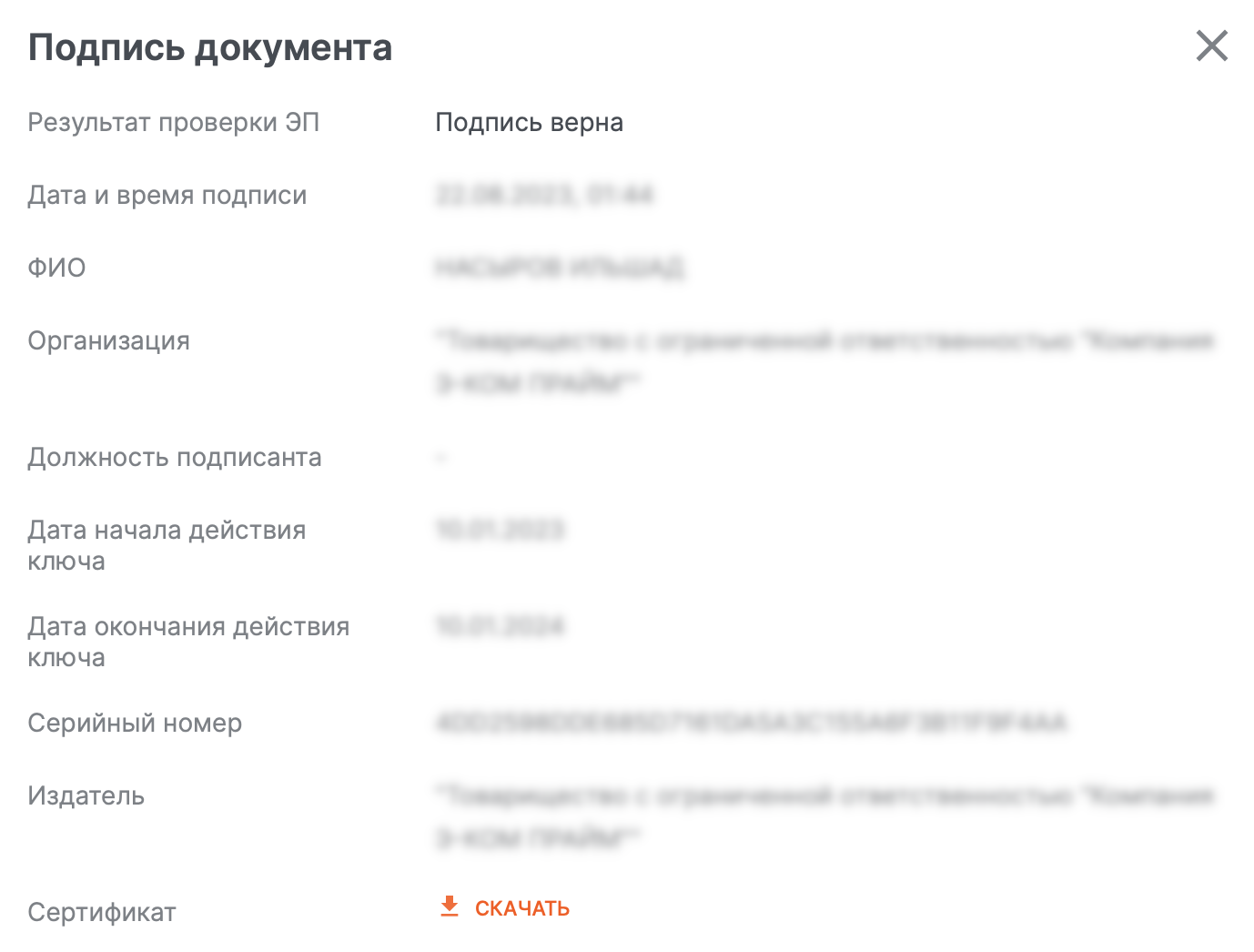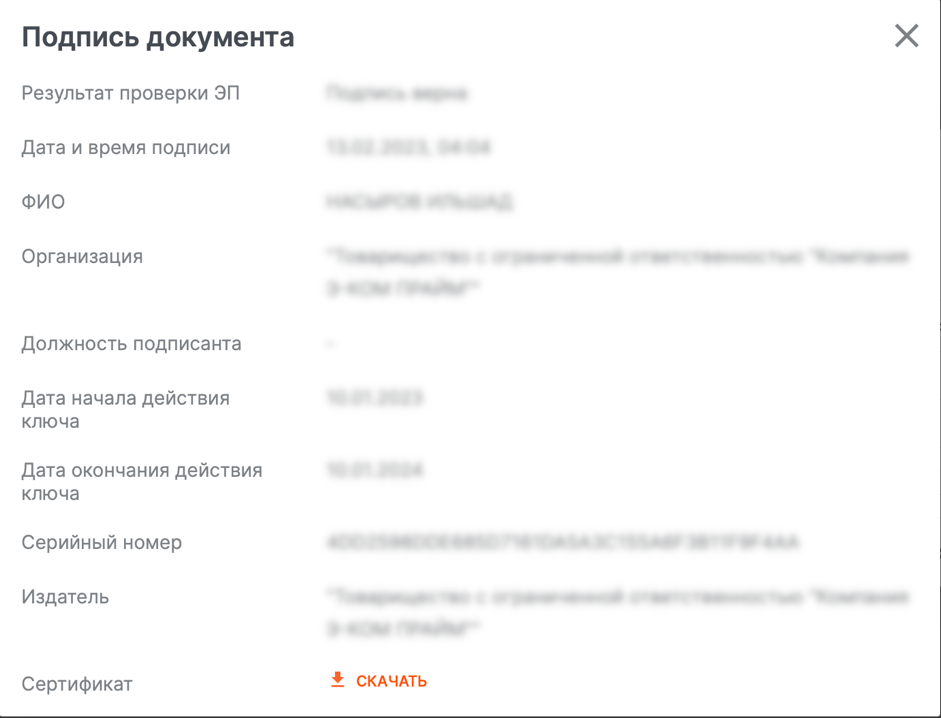 В окне Подпись документа приведена информация из сертификата с возможностью скачать сертификат.