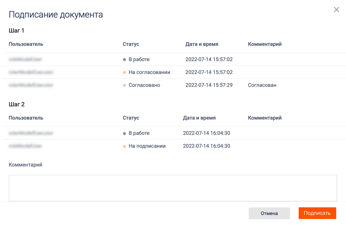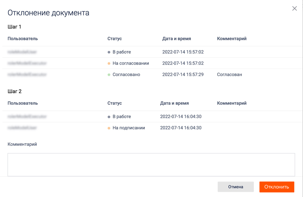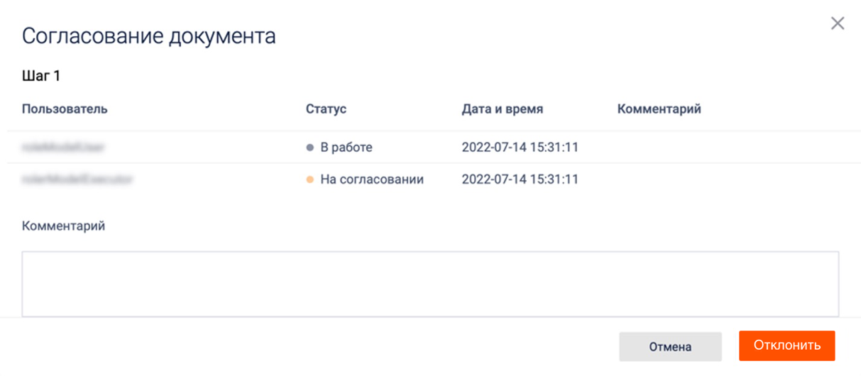 В открывшемся окне документ можно согласовать, отклонить, а также отменить маршрут согласования, воспользовавшись соответствующими кнопками, введя комментарий.