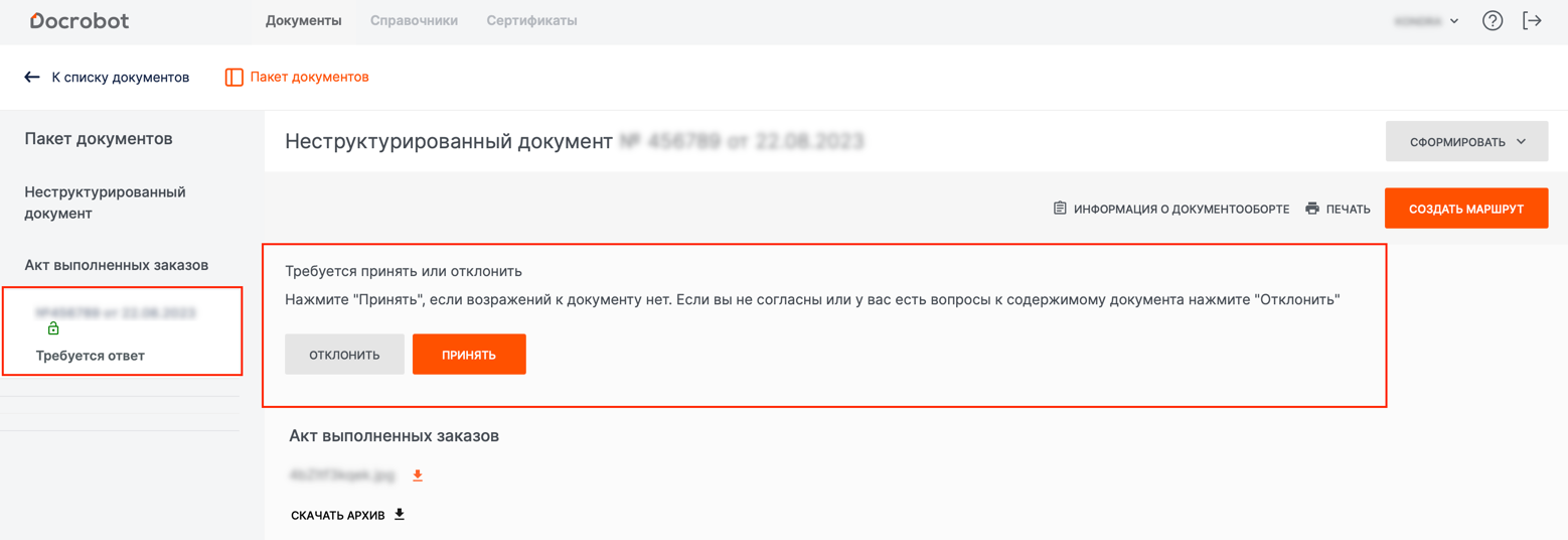 Если для принятия или отклонения документа его сначала нужно согласовать, для этого нужно воспользоваться кнопкой Маршрут.
