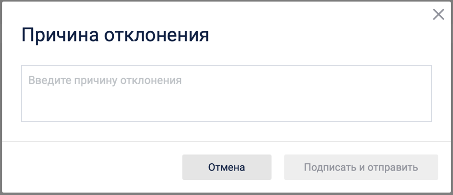При нажатии кнопки Принять (статус документооборота изменится на Завершен), откроется окно подписи файла, при нажатии кнопки Отклонить (статус документооборота изменится на Отклонен), в открывшемся окне следует ввести причину отклонения и нажать кнопку Подписать и отправить.